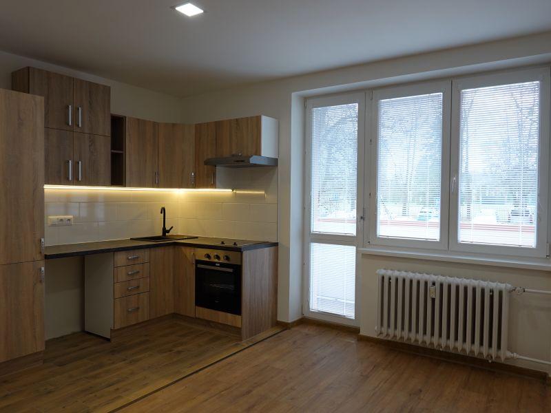 Byt o velikosti 1+KK s balkónem o celkové výměře podlahové plochy 23m2 včetně příslušenství je situován ve zvýšeném přízemí panelového bytového domu. Byt je tvořen vstupní předsíní, koupelnou společnou s WC (WC geberit, sprchovací kout, umyvadlo včetně skřínky pod umyvadlem) a jedním pokojem se vstupem na balkón. Byt je nově po kompletní rekonstrukci: nové vnitřní rozvody elektřiny 230V včetně zázuvek, vypínačů a osvětlení; nové vstupní a interiérové dveře; nové vestavěné skříně na míru v předsíni; nové keramické obklady a dlažba; nová sanita; nová plovoucí podlaha v předsíni a v pokoji; nová kuchyňská linka včetně vestavěné indukcní varné desky a elektrické trouby; jídelní kout; nové horizontální žaluzie jsou již objednány a budou dodány začátkem roku. Bytový dům je rovněž po kompletní revitalizaci a nachází se klidné části obce s výbornou dostupností veškerých služeb. Měsíční nájemné ve výši 11.000,- Kč je včetně zálohových plateb na služby spojené s užíváním bytu pro 1 osobu; dodávku elektrické energie si zajišťuje nájemce samostatně navíc. Byt je ihned k užívání.